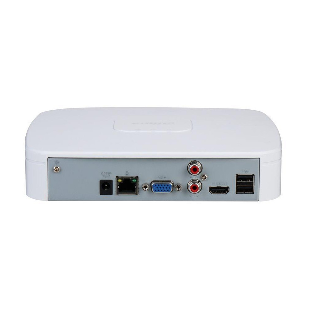 Síťový video rekordér Lite série pro 4 kamery, povoleny kombinace různých rozlišení do 12 Mpx, snímkování a datových toků do 80 Mb/s, podpora ONVIF (profil T/S/G), SDK, CGI a kamer dalších výrobců, podpora smart komprese H.265+/H.264+, SMD+ detekce pohybu.