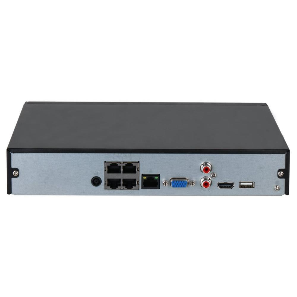 Síťový video rekordér Lite série pro 4 kamery, povoleny kombinace různých rozlišení do 12 Mpx, snímkování a datových toků do 80 Mb/s, podpora ONVIF (profil T/S/G), SDK, CGI a kamer dalších výrobců, podpora smart komprese H.265+/H.264+, SMD+ detekce pohybu. Podpora PoE napájení 802.3at/af s celkovým napájecím výkonem 36 W (max. 25,5 W/port).